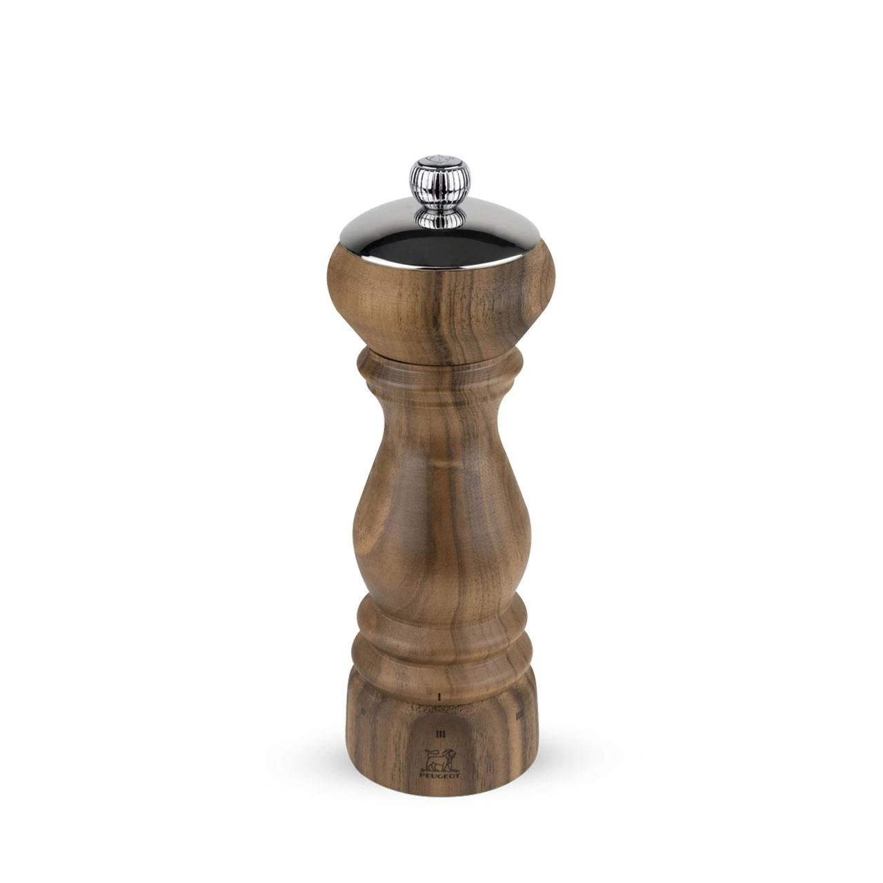 Die 18 cm große Paris Icône Salzmühle veredelt in einem wertvollen Holz, dem Nussbaum, das 1987 geschaffene emblematische Modell Paris. Mit einem matten Finish bewahrt das Nussbaumholz sein rohes naturnahes Aussehen und lässt die wunderbare Maserung in Erscheinung treten. Die glänzende Schale harmoniert vortrefflich mit dem Holz. Die Paris Icône Salzmühle aus Nussbaum verfügt über das u’Select-System zur Mahlgradregulierung, mit dem die gewünschte Salzgröße leicht gewählt werden kann. Sie ist auch mit dem Peugeot Salzmahlwerk ausgestattet, auf das in Deutschland eine 25-jährige Garantie gewährt wird. Sie wird in Ihrer Küche oder auf Ihrem Esstisch einen besonderen Platz einnehmen.